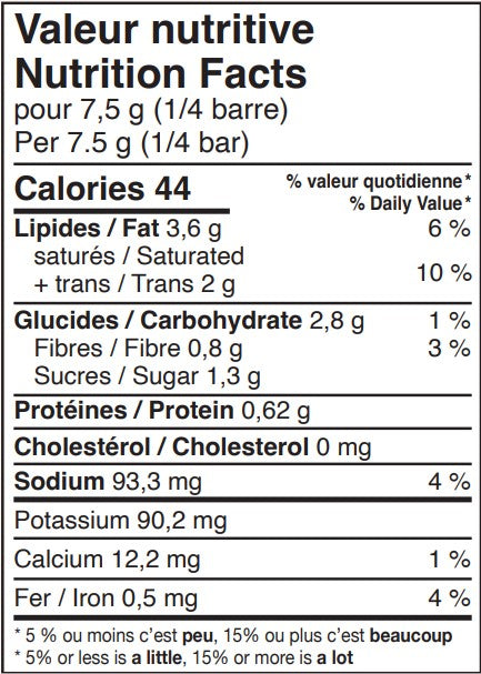 Ingredients: Cocoa butter, tomato*, parsley*, onion*, garlic*, salt, paprika*, cumin*, coriander*, turmeric*, cayenne pepper*, soy lecithin, lemon essential oil.