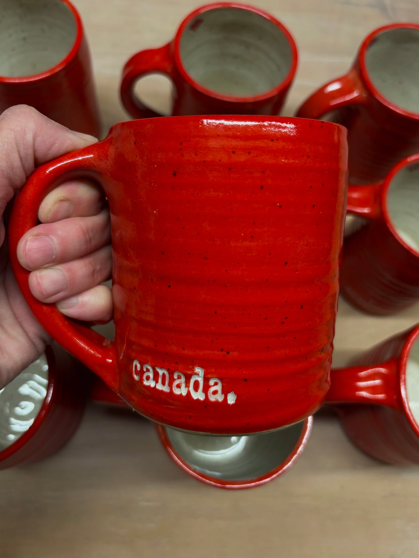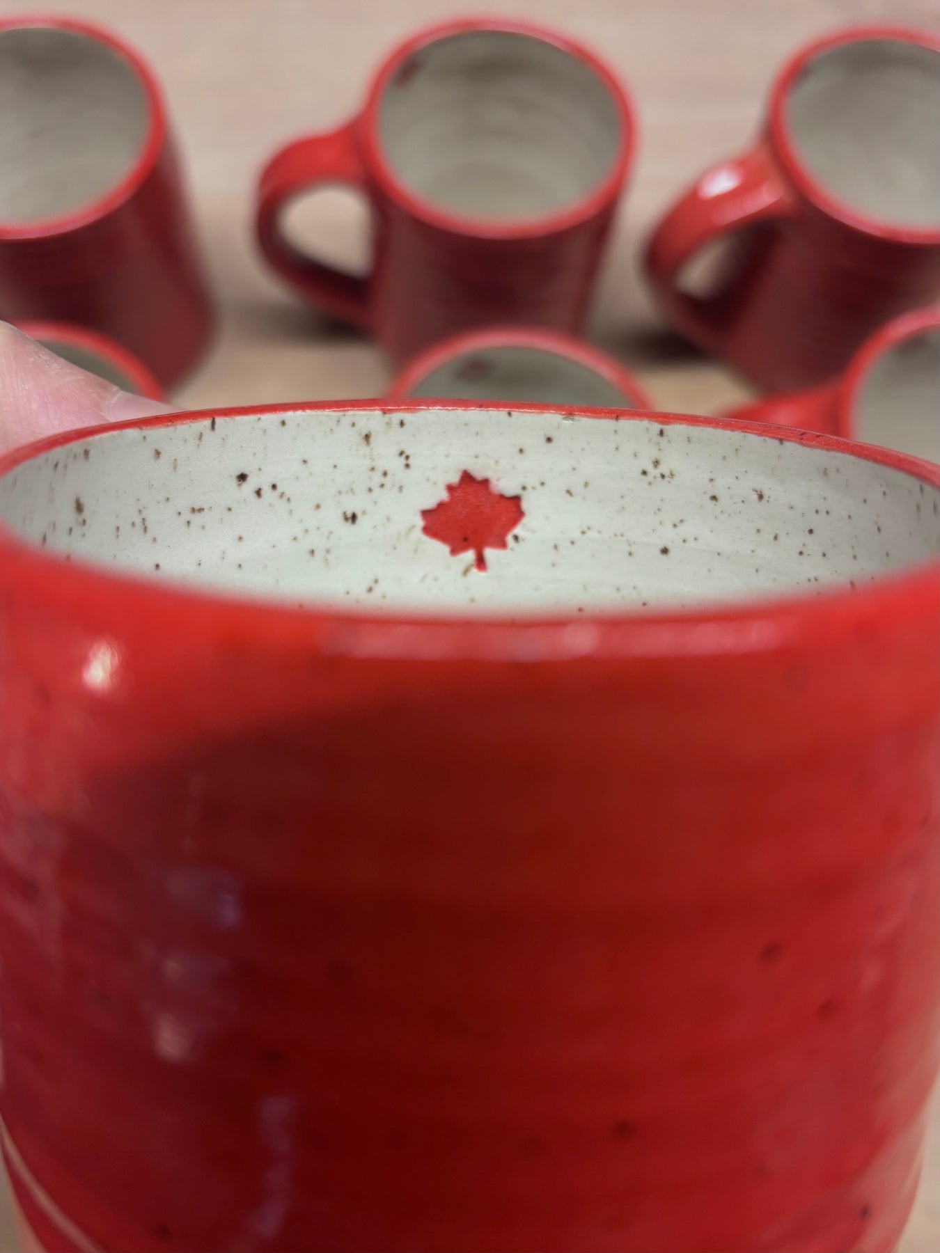 Regular price $38.00These red glazed mugs feature a Canada stamp and a white glazed interior with a tiny maple leaf so you can sip your favourite hot drinks in style. Made locally in Windsor Ontario, these mugs comfortably accommodate 10oz and are dishwasher and microwave safe.