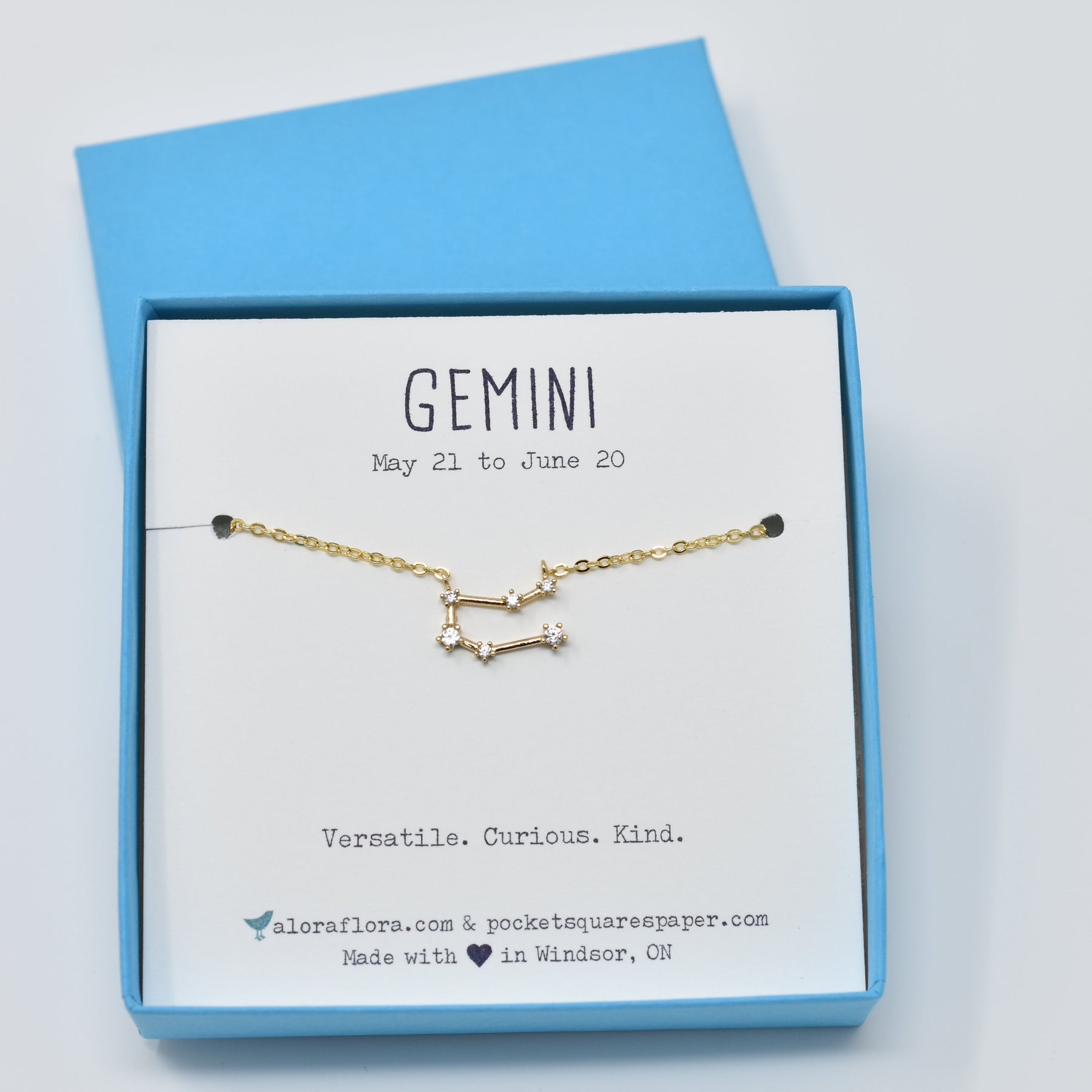 Geminis are sociable, communicative, thoughtful, quick-witted, and love to have fun, although sometimes they may suddenly get serious! No matter your sign, you're sure to love this dainty constellation necklace.
